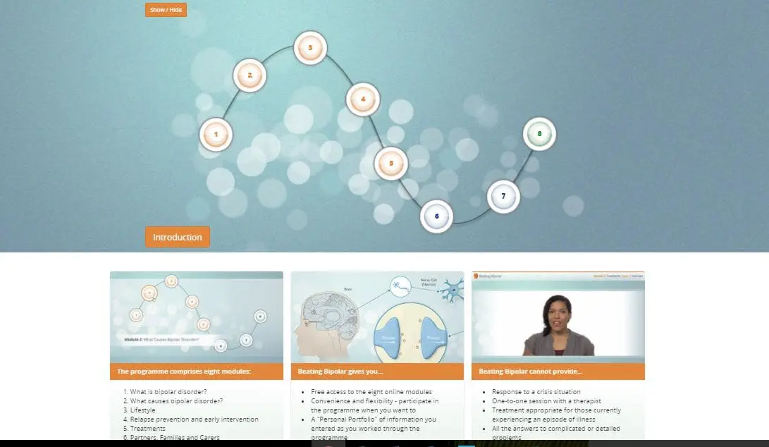 Beating Bipolar is a web based psychoeducation program intended to help users to cope with bipolar disorder. The program is comprised of 8 modules. Each module includes short videos of clinicians who deliver the psychoeducation and people dealing with Bipolar disorder that share some of their personal experience. Module’s topics include: what is Bipolar disorder? What causes Bipolar disorder? Lifestyle, Relapse prevention and early intervention; Treatments, Partners, Families and Carers; Women and bipolar disorder; and Bipolar and work. Throughout the program, some interactive tasks direct the user how to better manage their condition (e.g. mood charts, triggers). The program includes Additional support via an online forum moderated by “Bipolar UK”,  a charity dedicated to supporting individuals with bipolar disorder, offering peer support, information, and advocacy to improve understanding and reduce stigma.