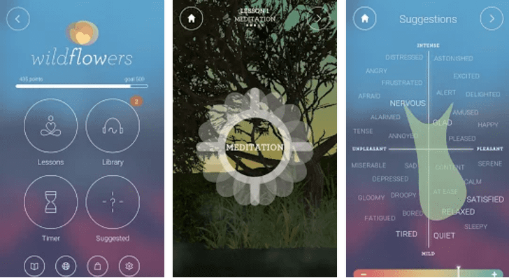 With the purpose of reducing stress, Wildflower Mindfulness blends guided audio meditation with biofeedback, visual features, and psychoeducation. Before and after each audio meditation, the user measures his biometric responses (e.g., heart rate) and provides self-reported data concerning his state. This feature allows tracking changes in the user’s responses and mood. As the program learns about the user, it provides a list of suitable 5–10-minute guided meditation audios. Although the different features of the app are well designed and based on clinical information, their incorporation creates unnecessary complications and potentially distract the user from the main objective of meditation. That being said, the program provides proactive learning about the link between Mindfulness and individual stressful experiences, when most other Mindfulness programs do not emphasize this learning.